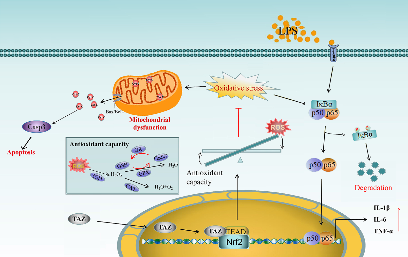 小胶质细胞的持续激活是慢性神经炎症发生的重要因素,可参与大多数神经退行性疾病的发展。TAZ是Hippo信号通路中的关键效应蛋白,在癌细胞转移和器官发育等领域被广泛研究,但其在小胶质细胞介导的炎症反应中的功能尚未见报导。课题组研究发现,过表达TAZ可阻止小胶质细胞中促炎细胞因子的释放。TAZ进入细胞核后可与TEAD相互作用,锚定于Nrf2启动子区域从而激活Nrf2的转录,促进Nrf2的核转位,增强细胞的抗氧化能力,降低细胞内ROS水平,减轻细胞的氧化应激,阻止NF-κB信号通路的激活。同时,TAZ可通过Nrf2来改善细胞内ATP水平、mtDNA拷贝数和线粒体膜电位,阻止线粒体通透性转换孔的打开,抑制细胞色素C从线粒体释放到胞质中,减少小胶质细胞的凋亡。研究结果可为神经退行性疾病的治疗提供一个潜在的新靶点。