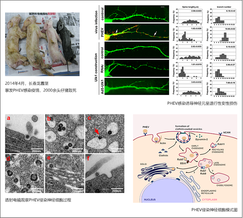 冠状病毒对人类的危害已得到共识,与之类似,猪的多种冠状病毒感染流行对养猪业的危害也十分巨大。其中,猪血凝性脑脊髓炎病毒(Porcine hemagglutinating encephalomyelitis virus,PHEV)与SARS-CoV-2、MERS-CoV等同为β属冠状病毒,可引起幼龄仔猪呕吐、神经功能障碍等临床特征,出现非化脓性脑脊髓炎的病例死亡率可达100%。PHEV所致的神经损伤是造成宿主表现神经症状及死亡的重要原因,但其损伤神经的机制还不清楚。本成果先后从病毒感染启动、病毒侵入途径、病毒胞内转运模式、神经细胞变性损伤等多个角度开展基础研究,系统地解析了PHEV感染及致神经功能损伤的分子机制。截止2019年底,相关研究成果已公开发表学术论文20篇(3篇收录于病毒学领域TOP期刊Journal of Virology),完成4项国家自然基金结题和1项吉林省重点科技攻关项目验收,科学发现的原创性得到了国内外同行的一致肯定和好评。