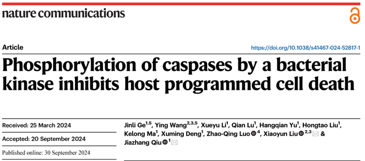2024年9月30日,吉林大学邱家章教授团队在学术期刊《Nature Communications》上发表,题为“Phosphorylation of caspases by a bacterial kinase inhibits host programmed cell death”的研究论文。