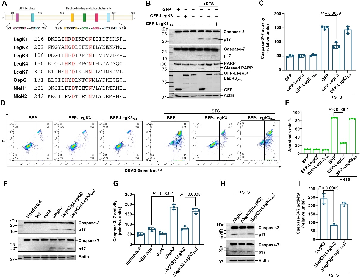 该研究旨在深度探索嗜肺军团菌如何操纵宿主细胞凋亡途径。研究人员发现激酶LegK3是嗜肺军团菌感染宿主细胞过程中的一个重要调节因子,能够抑制宿主细胞凋亡(图1)。