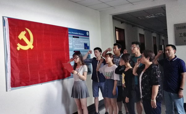 伴随着《国际歌》的奏响,宣誓仪式开始,由饶家辉副书记宣读新党员名单。随后,在党员杨蕊同志的带领下,支部5名新党员怀着无比激动的心情举起右手握拳,面对鲜红的党旗齐声宣读入党誓词,同学们用响亮的声音表明了为共产主义事业奋斗的决心,向党组织做出了庄严宣誓。