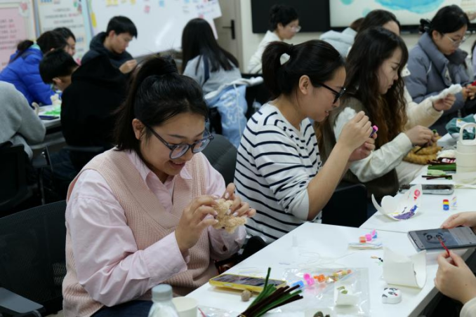 本次活动为同学们准备了五颜六色的编织材料包和形态各异的石膏娃娃及彩绘颜料。首先由主持人向同学们介绍了本次活动的主题与流程,鼓励同学们自由组队。随后在工作人员的引导下,同学们纷纷开始创作,充分发挥想象力,编织和描绘属于自己个性而富有创意的作品。创作过程中现场气氛热烈,充满欢声笑语。有人编织出了可爱的小狗狗,有人绘制出俏皮可爱的卡通形象;在一笔一画、一编一织间,同学们不仅舒缓了紧张情绪,更沉浸在创作的乐趣中。