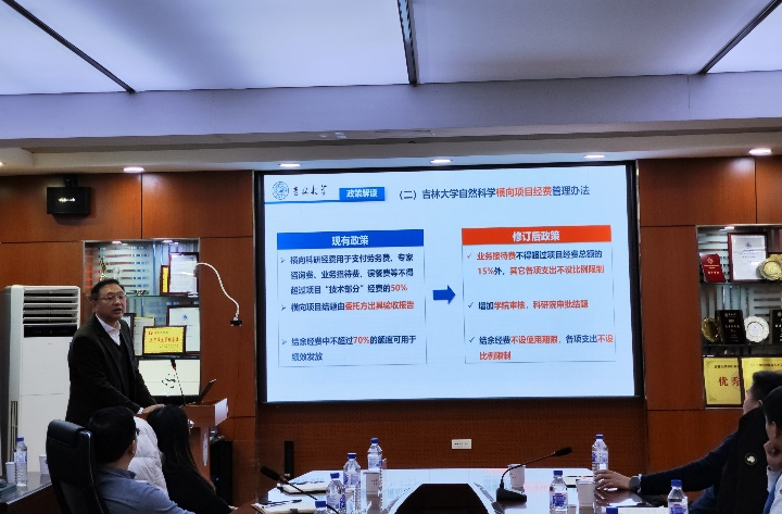接下来科研院科技开发办公室刘岩峰主任从政策解读、转化模式、概念验证、服务平台四个方面进行了宣讲。强调科技成果转化是一个复杂的系统工程,面临着从实验室到产业化、从想法到市场的挑战。破解科技成果转化难题,是一道时代的必答题。刘岩峰主任介绍说,吉林大学为了促进科技成果落地转化,对现有政策进行了一系列修订。这些修订包括出台了结余经费不设使用期限,各项支出不设比例限制等。此外,吉林大学还在教师申报教授,副教授增加了成果转化岗等一系列高含金量的政策措施。这一系列举措为科技成果落地转化“架桥铺路”,让更多科技成果通过转化“开花结果”,落地生“金”。