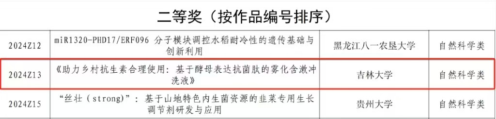 研究生科研办主任李赫老师和研究生科研办张茜老师带队、韩文瑜教授和冯新教授指导的研究生团队(曹原、张涵、刘月、柴晓东、杜晓莹、王秋霖)申报的《助力乡村抗生素合理使用——基于酵母表达抗菌肽的雾化含漱冲洗液》项目在此次竞赛中斩获自然科学组二等奖,为百家乐真人视讯